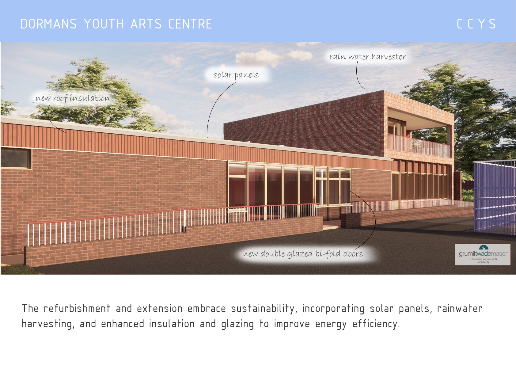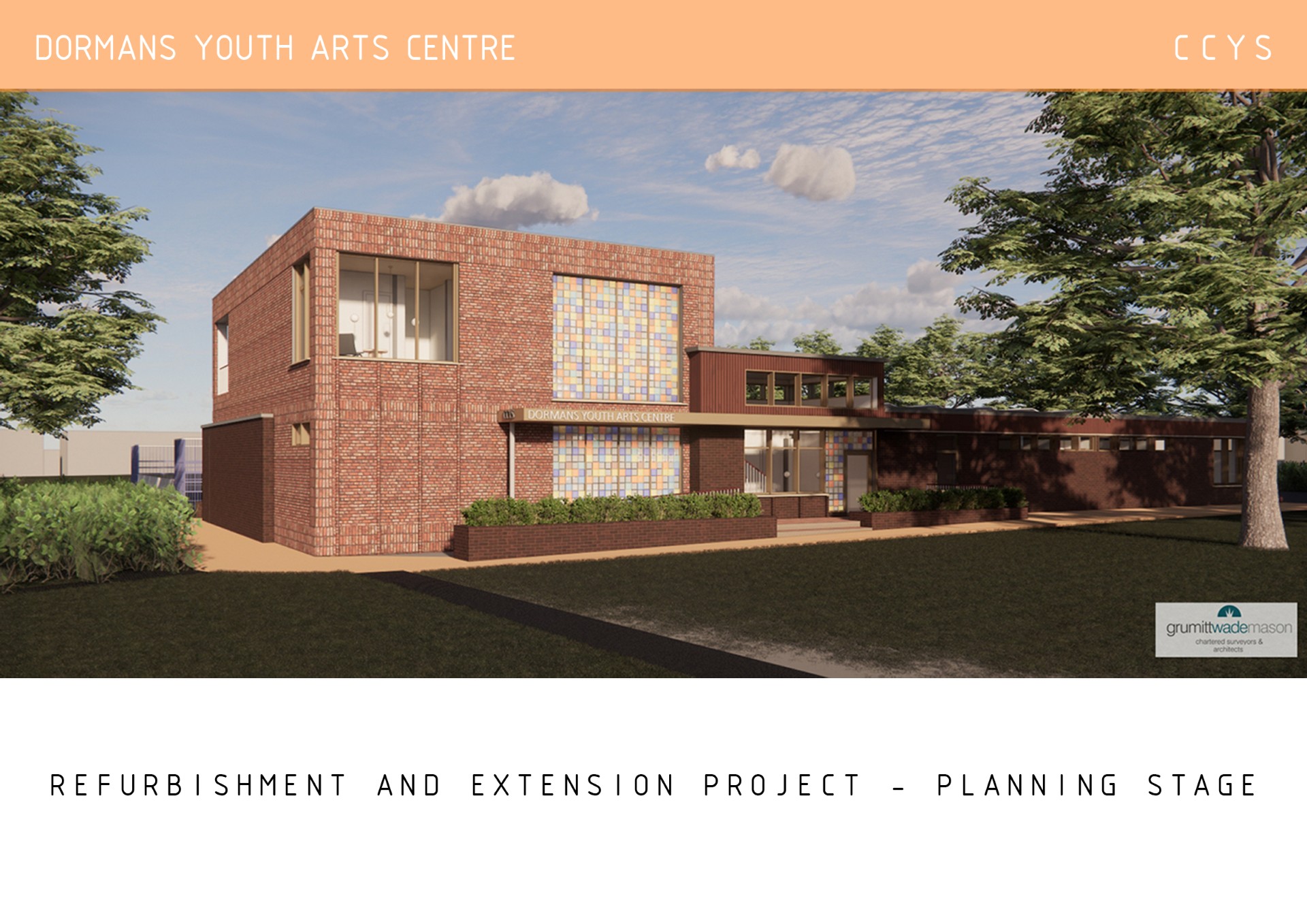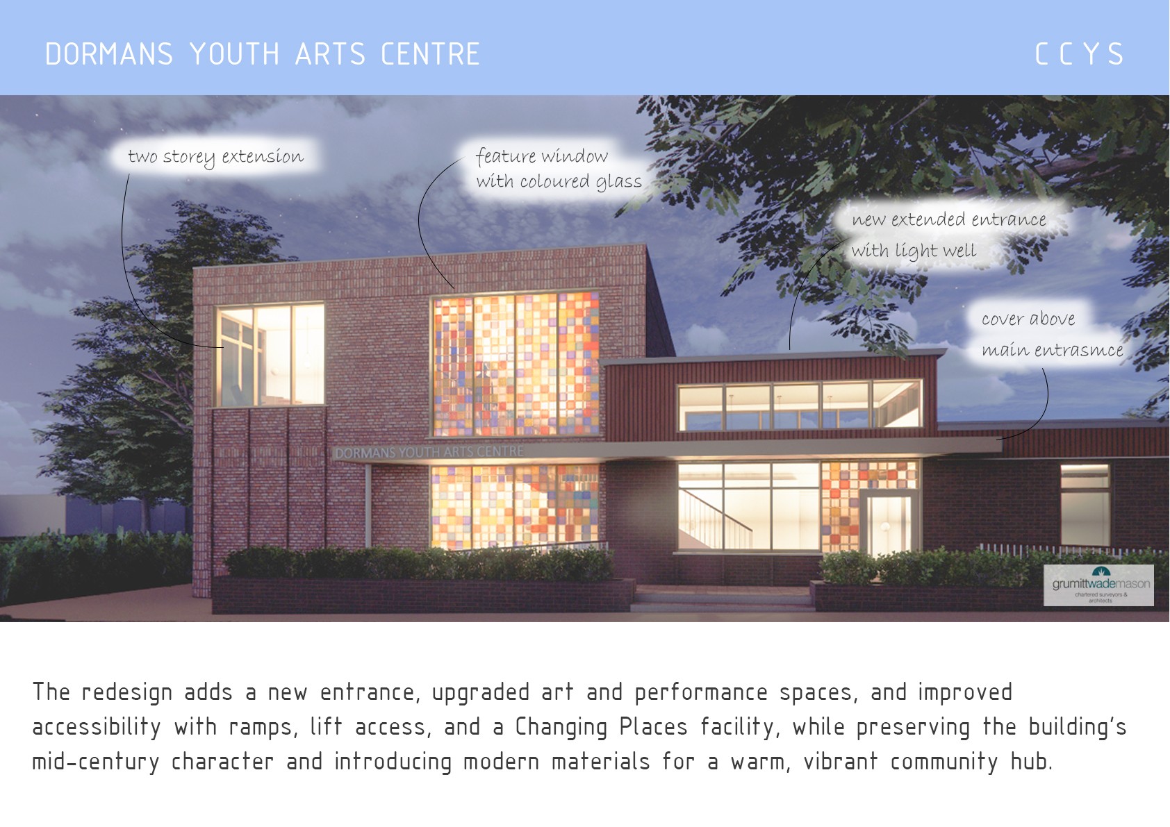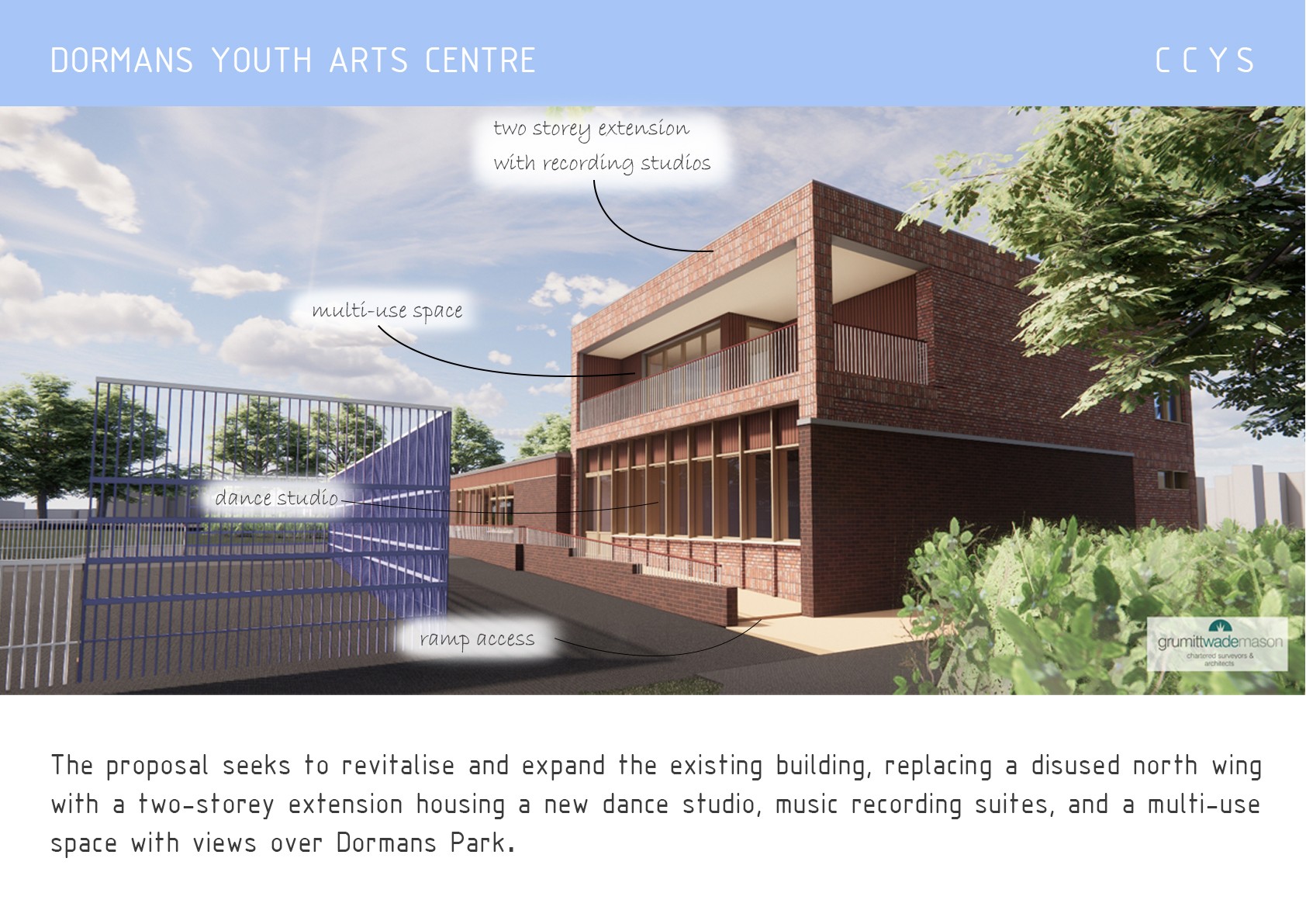 With the support of Grummitt Wade Mason we are pleased to present these images of a plan to revitalise and expand the existing building, replacing a disused north wing with a two-storey extension housing a new dance studio, music recording suites, and a multi-use space with views over Dormans Park. The redesign also includes a new entrance, improved art and performance spaces, and enhanced accessibility through ramps, lift access, and a Changing Places facility.